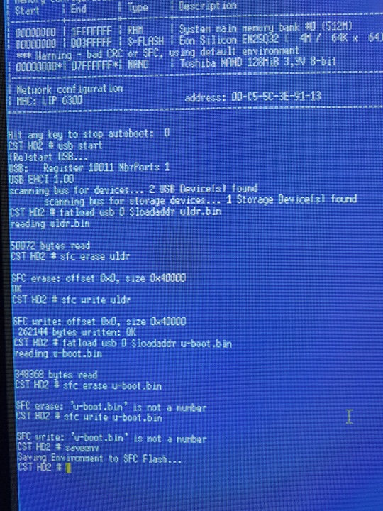 bei der anderen Version funktioniert es bis zur 'u-boot' is not a number, dann noch speichern ausschalten Jumper weg und neu starten, zwei mal blinken immer mit Powertaste aber sie bootet nicht vom USB.