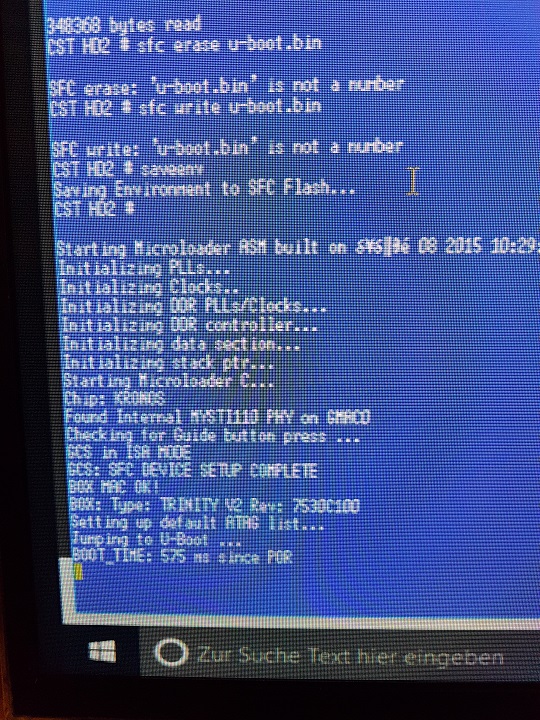 Hallo ich bin neu hier und habe meine neue Trinity Duo gegrillt beim Image flashen. Die Wiederherstellung klappt auch nicht. Komme zwar zurecht mit der Anleitung funktioniert auch alles bis zum Neustart der Box nach Jumper Entfernung, den sie startet nicht von USB. Noch ein Problem auf dem Gehäuse steht Duo und im Startlog steht v2 was ist nun richtig. Ich habe mal die Bilder vom Teraterm angehängt, vll kann ja jemand helfen.
