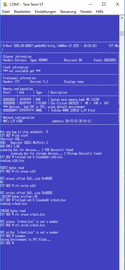 ich habe schon beide Versionen ausprobiert, beim Bootlog mit Putty fehlt am ende CST HD2 _ und man kann keine weiteren Befehle eingeben.