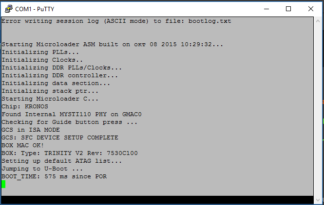 Ich bin mit nullmodem Kabel auf der Box. Der Schwarze Bildschirm vom Putty ist der ganze Bootlog mehr kommt da nicht beim ausschalten der Box. Ich habe probiert den Text mit der Maus zu kopieren und einzufügen aber ohne erfolg es lässt sich makieren aber nicht Kopieren und so schneide ich den Bildschirm immer aus speicher ihn und hänge Ihn als Datei an. Für Ratschläge immer Offen. Beim TeraTern habe ich den log gespeichert wollt Ihn anhängen aber ohne erfolg. Kann es aber jederzeit wiederholen.
