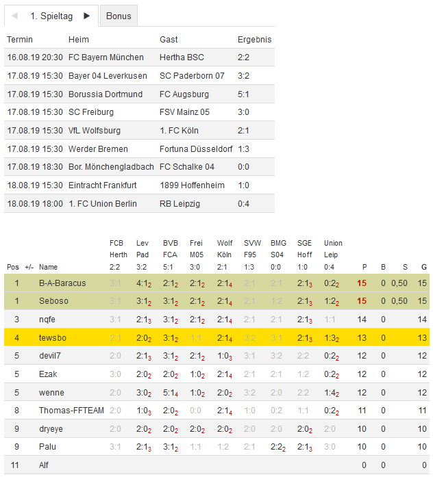 Stand 01. Spieltag - NI-Tippspiel zur Bundesligasaison 2019/20