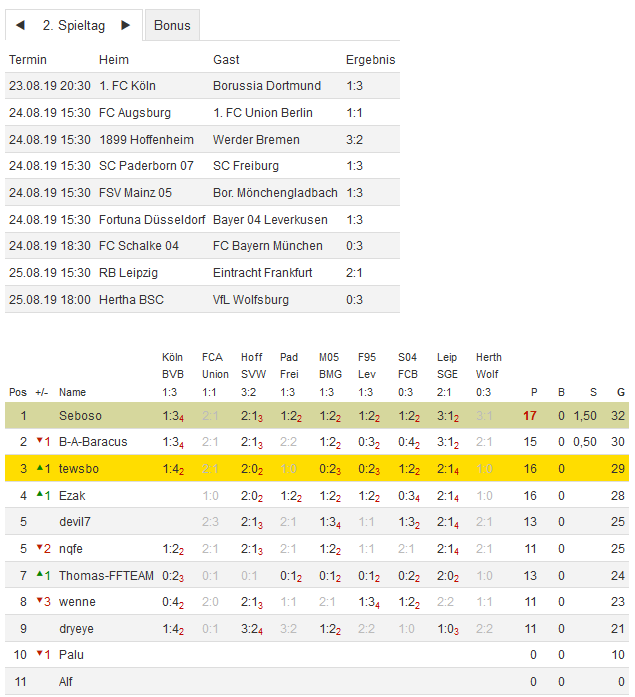 Stand 02. Spieltag - NI-Tippspiel zur Bundesligasaison 2019/20