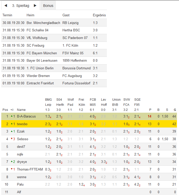 Stand 03. Spieltag - NI-Tippspiel zur Bundesligasaison 2019/20