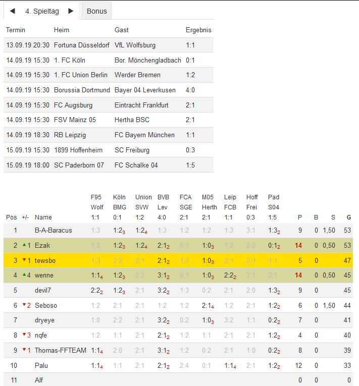 Stand 04. Spieltag - NI-Tippspiel zur Bundesligasaison 2019/20