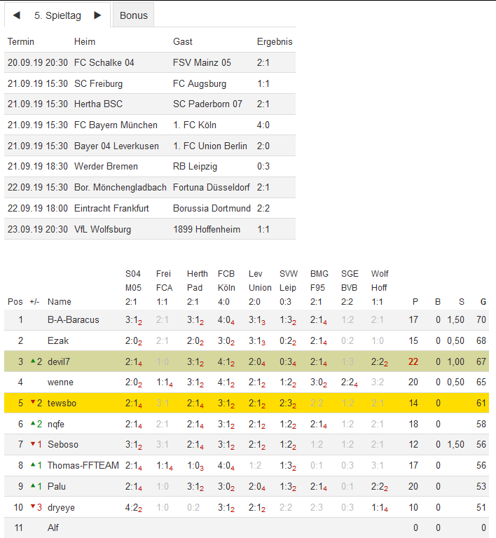 Stand 05. Spieltag - NI-Tippspiel zur Bundesligasaison 2019/20