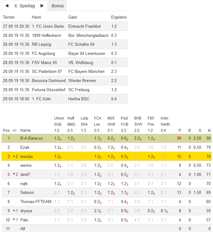 Stand 06. Spieltag - NI-Tippspiel zur Bundesligasaison 2019/20
