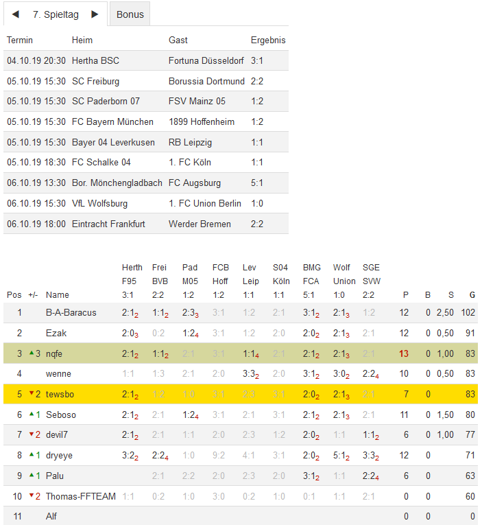 Stand 07. Spieltag - NI-Tippspiel zur Bundesligasaison 2019/20