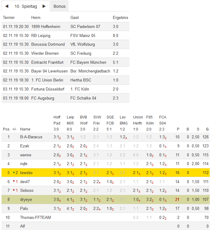 Stand 10. Spieltag - NI-Tippspiel zur Bundesligasaison 2019/20