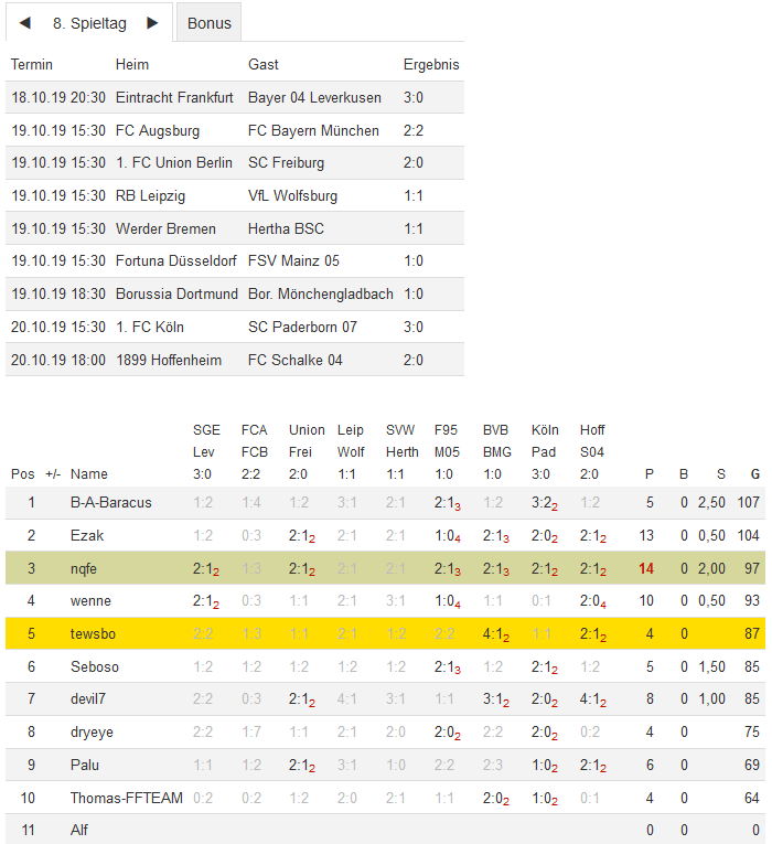 Stand 08. Spieltag - NI-Tippspiel zur Bundesligasaison 2019/20