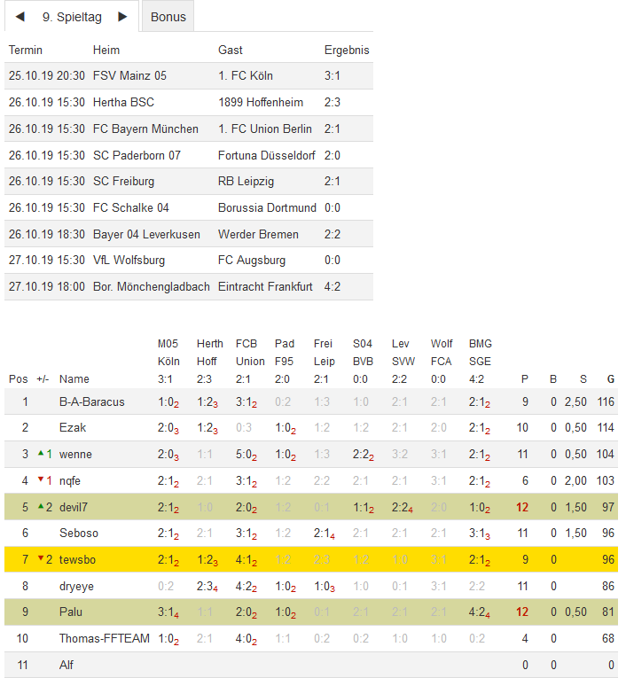 Stand 09. Spieltag - NI-Tippspiel zur Bundesligasaison 2019/20