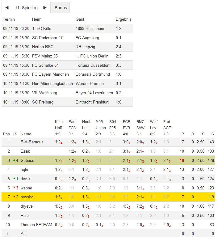 Stand 11. Spieltag - NI-Tippspiel zur Bundesligasaison 2019/20