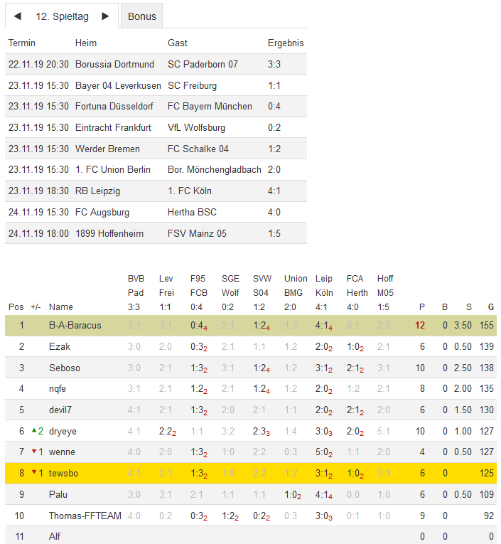 Stand 12. Spieltag - NI-Tippspiel zur Bundesligasaison 2019/20