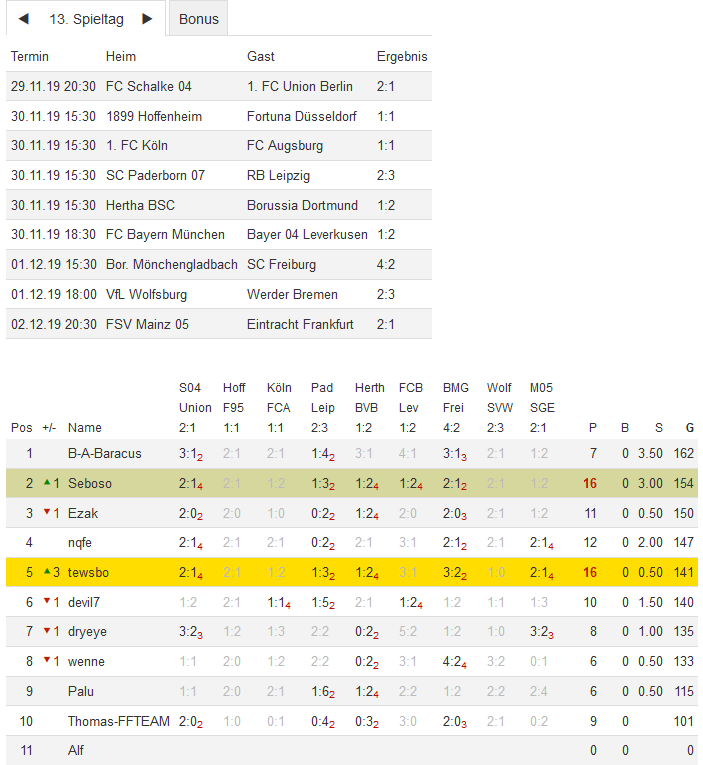 Stand 13. Spieltag - NI-Tippspiel zur Bundesligasaison 2019/20