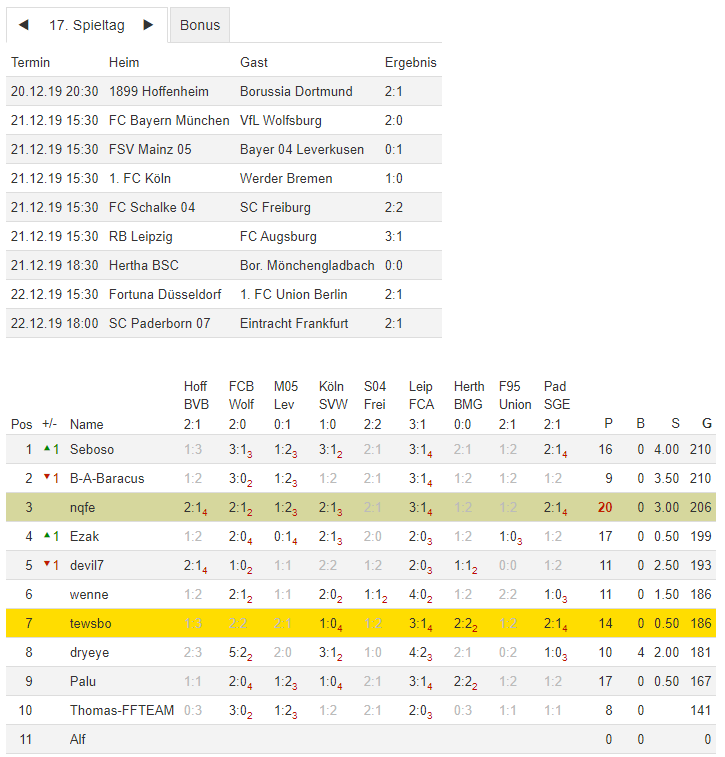 Stand 17. Spieltag - NI-Tippspiel zur Bundesligasaison 2019/20