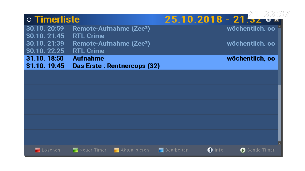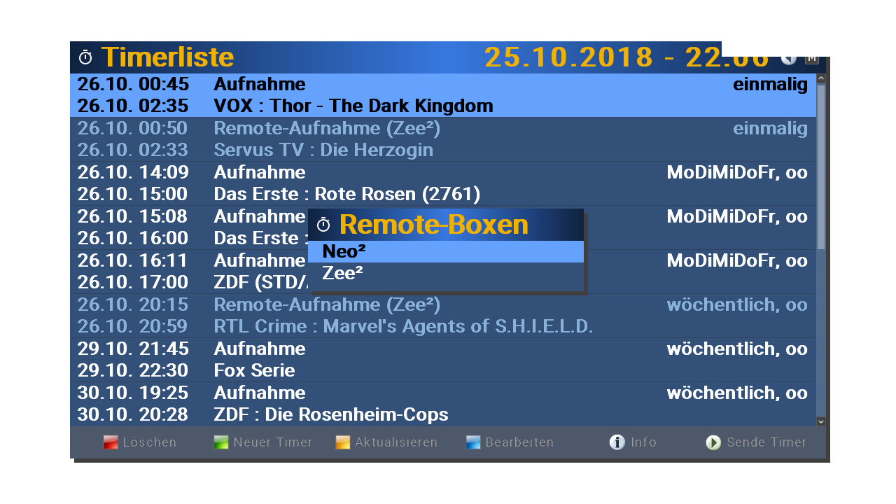 Zurück zum Thema , das Timer Senden : also unten rechts im Menü-Bild Timer erscheint jetzt der Punkt Timer Senden , beim betätigen wird genau nur dieser ausgewälte Timer zu einem weiteren CST-Gerät gesendet ( die CST-Geräte müssen natürlich im Home-Netz erscheinen ! ) und der eigentliche Timer wird dann ausgegraut . Bei mehren CST-Boxen erscheint dann ein Auswahl-Menü ...Es ist besonders praktisch bei Single-Tuner-Boxen wenn sich Timer überschneiden o.ä. , ich habe diese Woche das öfter schon genutzt , sehr angenehm , brauche nicht mehr ins andere Zimmer gehen wie früher bei solchen Timerüberschneidungen usw. ... anbei Fotos