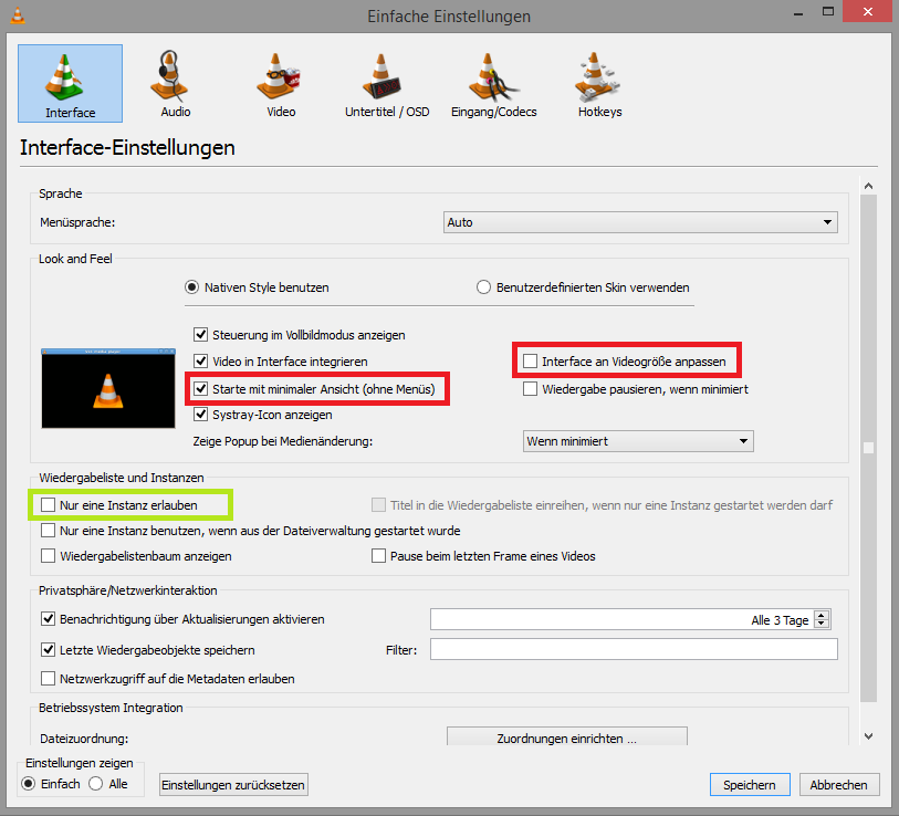 Hier mal die Einstellungen, die ich im VLC vornehme, damit das Fenster nur mit Rahmen und der von mir eingestellten Größe startet. Zur Größeneinstellung genügt übrigens das einmalige Zurechtziehen mit der Maus. (Im grünen Kästchen kann man festlegen, dass der VLC einen neuen Stream nicht in einer neuen Instanz öffnet. Falls man zappen möchte..) Das war es schon