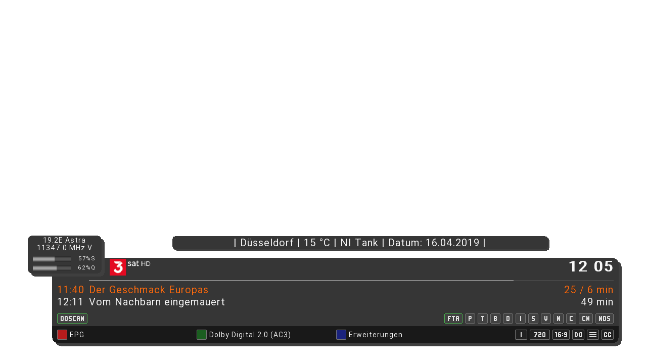 diese zusätzliche Zeile mit der Wetter Info über der Infobar bekomme ich auch nicht hinfred_feuerstein hat geschrieben: ↑So 14. Apr 2019, 18:23 Die infobar.txt wird nach wie vor unterstützt und hat nichts mit der darksky api zu tun.