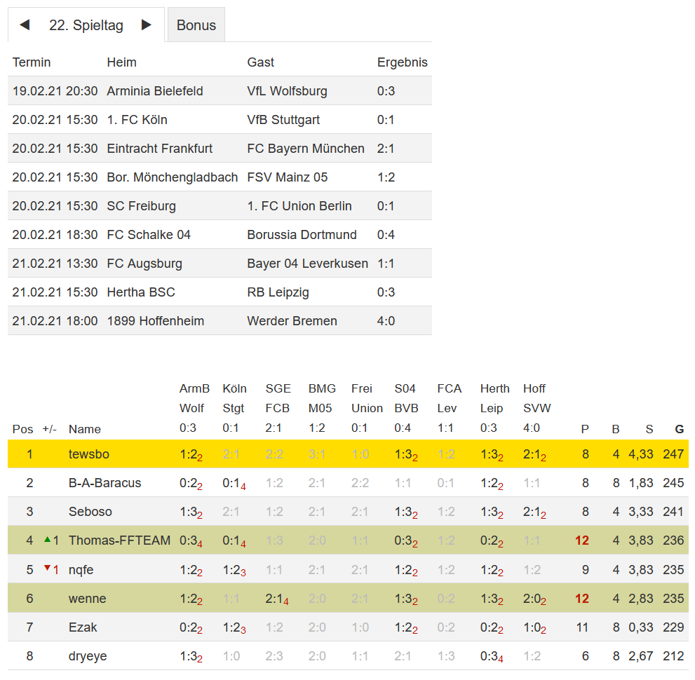 Stand 22. Spieltag - NI-Tippspiel zur Fussball-Bundesligasaison 2020/21