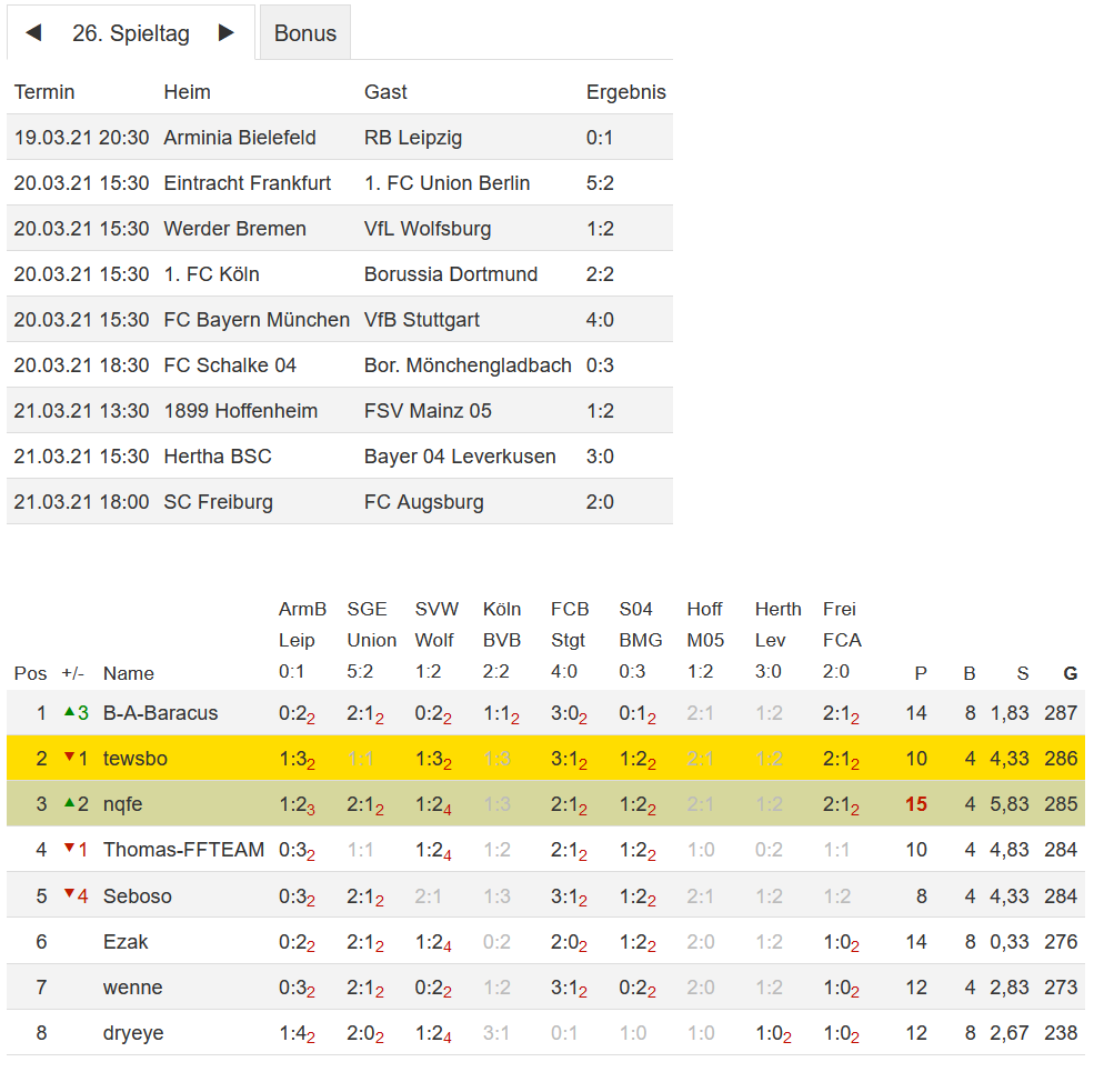 Stand 26. Spieltag - NI-Tippspiel zur Fussball-Bundesligasaison 2020/21