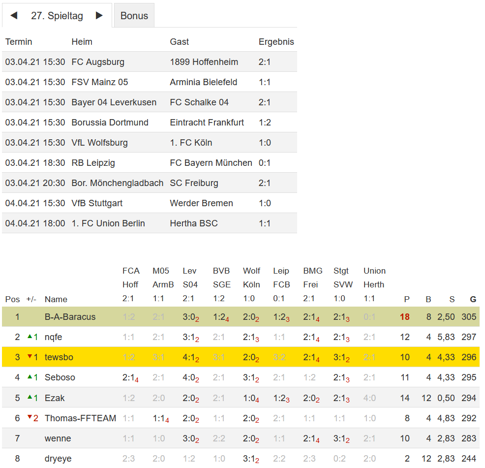 Stand 27. Spieltag - NI-Tippspiel zur Fussball-Bundesligasaison 2020/21