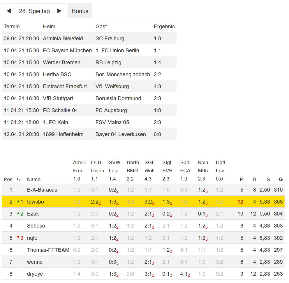Stand 28. Spieltag - NI-Tippspiel zur Fussball-Bundesligasaison 2020/21