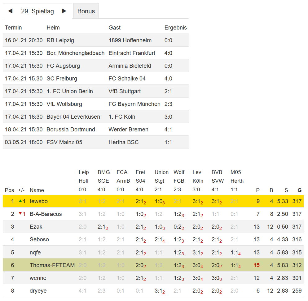 Stand 29. Spieltag - NI-Tippspiel zur Fussball-Bundesligasaison 2020/21