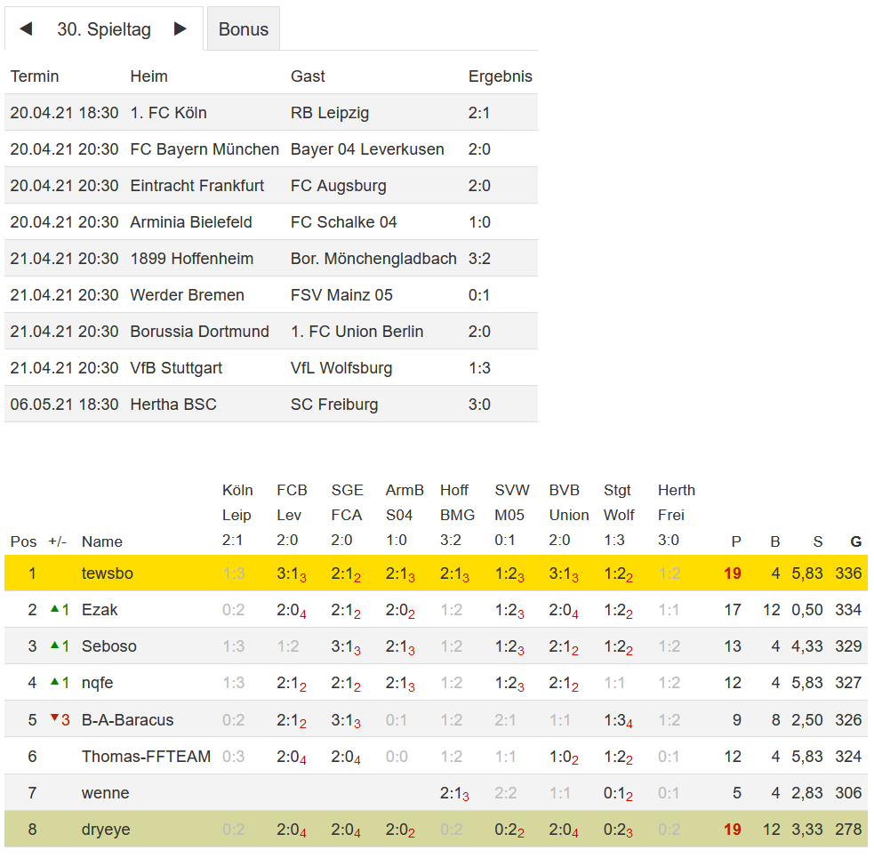 Stand 30. Spieltag - NI-Tippspiel zur Fussball-Bundesligasaison 2020/21