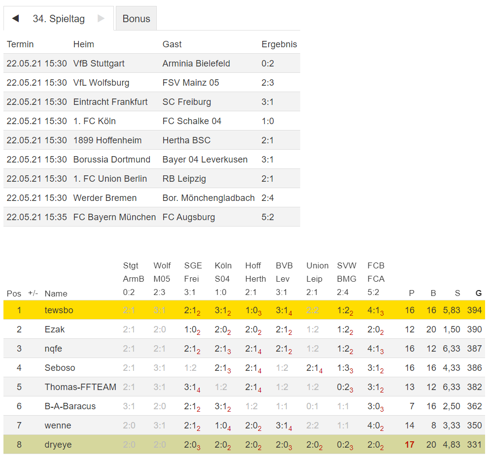 Stand 34. Spieltag - NI-Tippspiel zur Fussball-Bundesligasaison 2020/21son 2020/21
