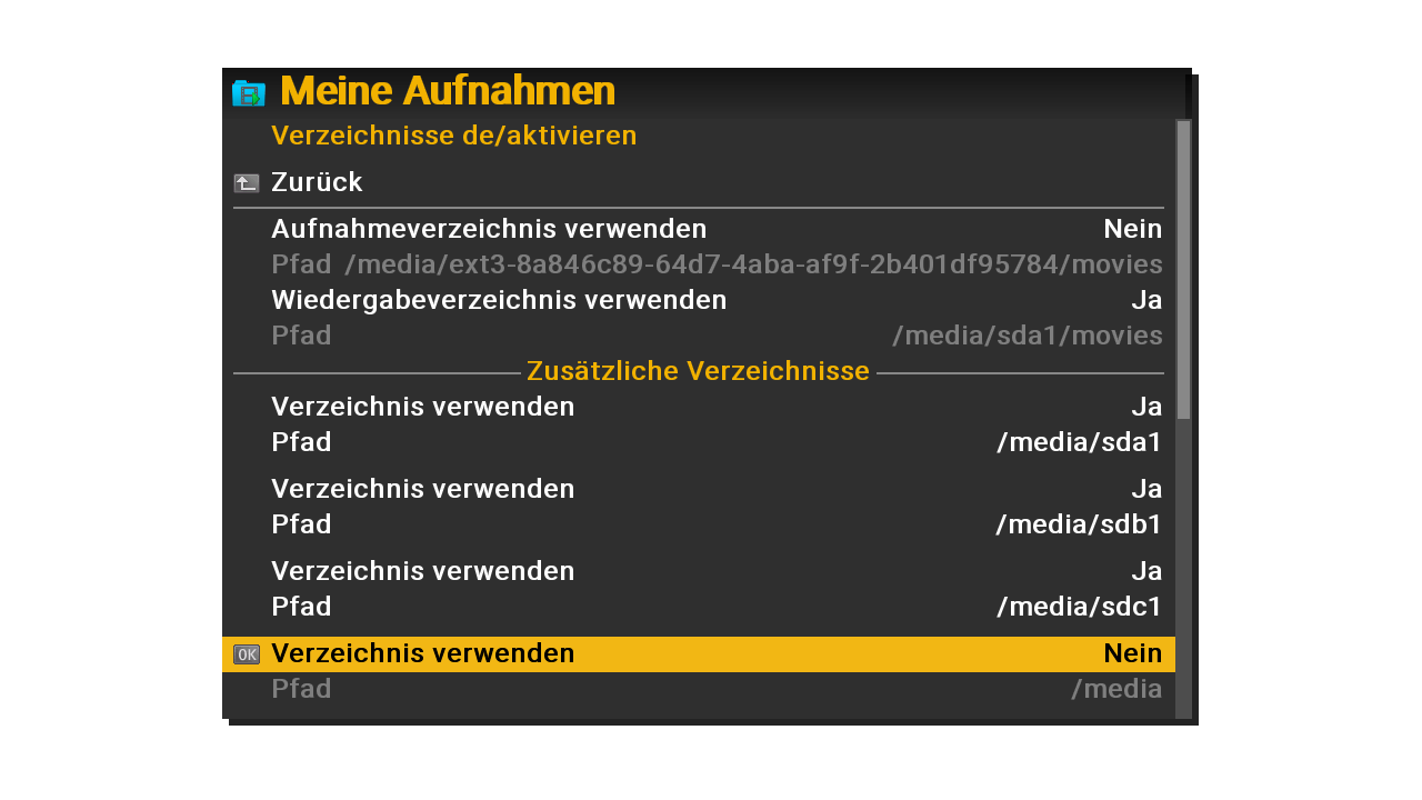 Warum ?mirz hat geschrieben:du hast jetzt das Aufnahmeverzeichnis auf "Nein" gestellt. Das solltest du wohl an lassen.