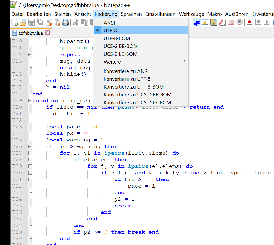 Wenn festgestellt wird, dass die Datei UTF-8 ist, wird sie als solche behandelt und beim Öffnen intern in Unicode (16-Bit) zur Bearbeitung konvertiert. In der Statusleiste wird dies mit "UTF-8" angezeigt. Wenn die Datei gespeichert wird, wird sie von Unicode in UTF-8 zurückkonvertiert und in diesem Format gespeichert.
