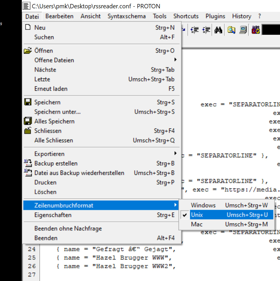 siehe screenshots am beispiel der editoren proton bzw. notepad++