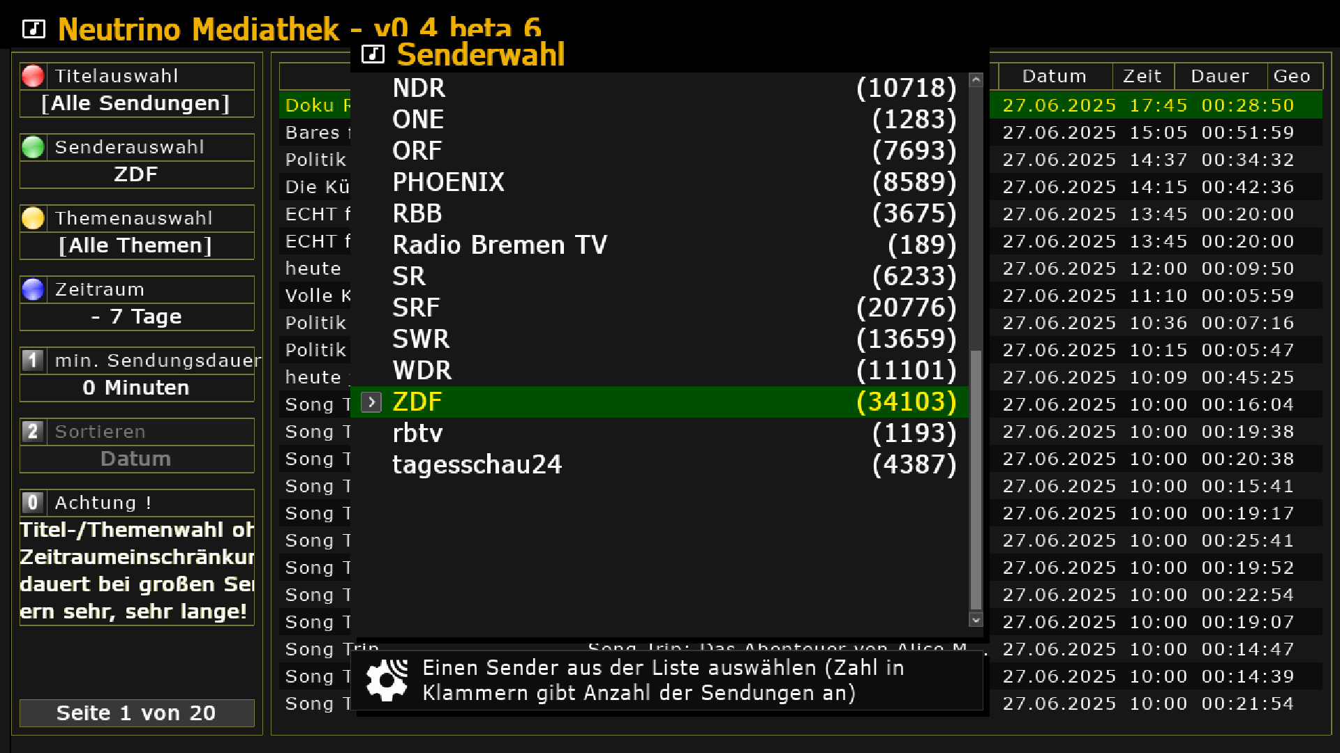 Hier mit den gleichen Sendern wie in der Mediathek: