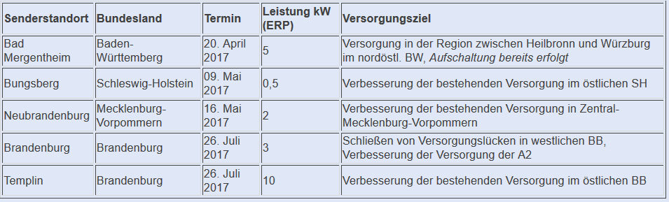 Für 2017 ist darüber hinaus die Inbetriebnahme von weiteren Senderstandorten zur Verbreitung des nationalen Digitalradio-Programmangebotes geplant. Details hierzu gibt MEDIA BROADCAST nach Abschluss der Planungen bekannt.