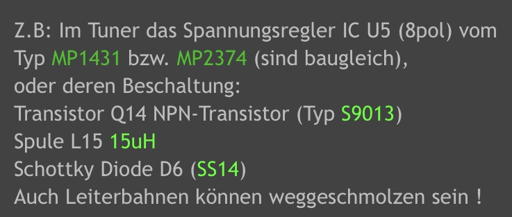 Nicht zwingend aber bei Empfangsproblemen ist U5 auf der Tunerleiterplatte prüfen (14/18V LNB-Spannung).