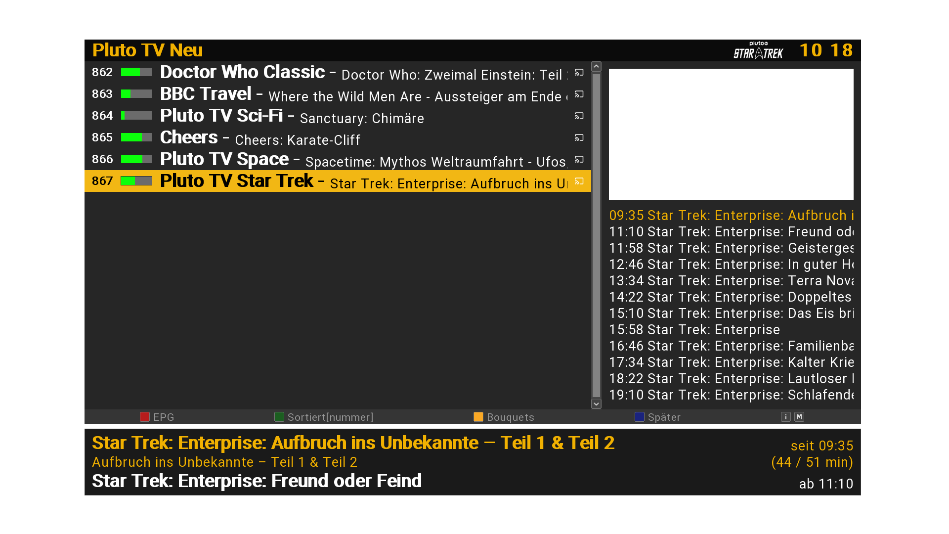 Wer das Pluto-TV-Update ausführt, hat "Star Trek" dann im Bouquet "Pluto TV Neu". Allerdings noch ohne EPG. Das kommt aber sicher auch irgendwann.