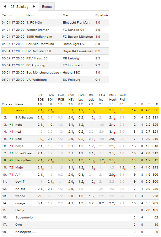 Stand 27. Spieltag - NI-Tippspiel zur Bundesligasaison 2016/17