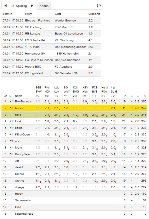 Stand 28. Spieltag - NI-Tippspiel zur Bundesligasaison 2016/17