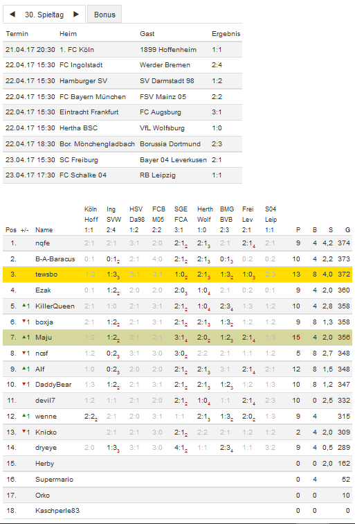 Stand 30. Spieltag - NI-Tippspiel zur Bundesligasaison 2016/17