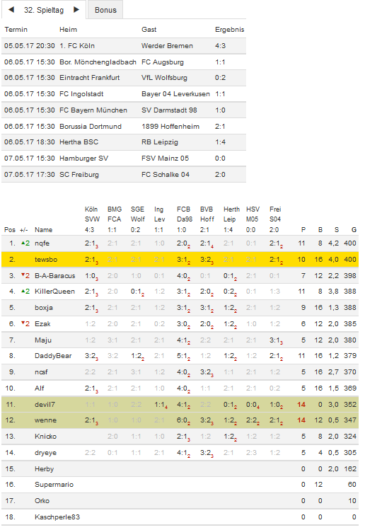 Stand 32. Spieltag - NI-Tippspiel zur Bundesligasaison 2016/17