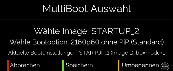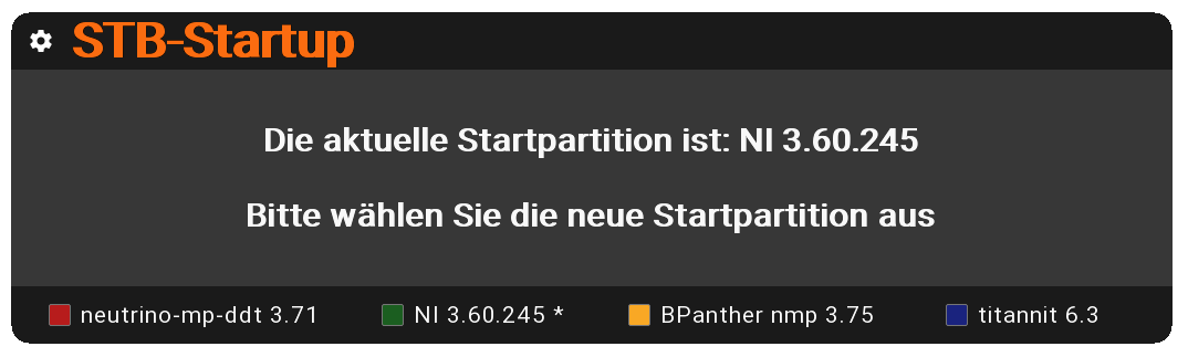 Und siehe da > es bootet und auch da sind die 'E2-Spielregeln' drinne, so dass es im Neutrino stb-startup.lua angezeigt wird. Innerhalb Titan kann man auch zu den anderen Image zurückschalten, es werden aber keine Namen angezeigt nur : STARTUP_1 / _2 / _3 / _4.