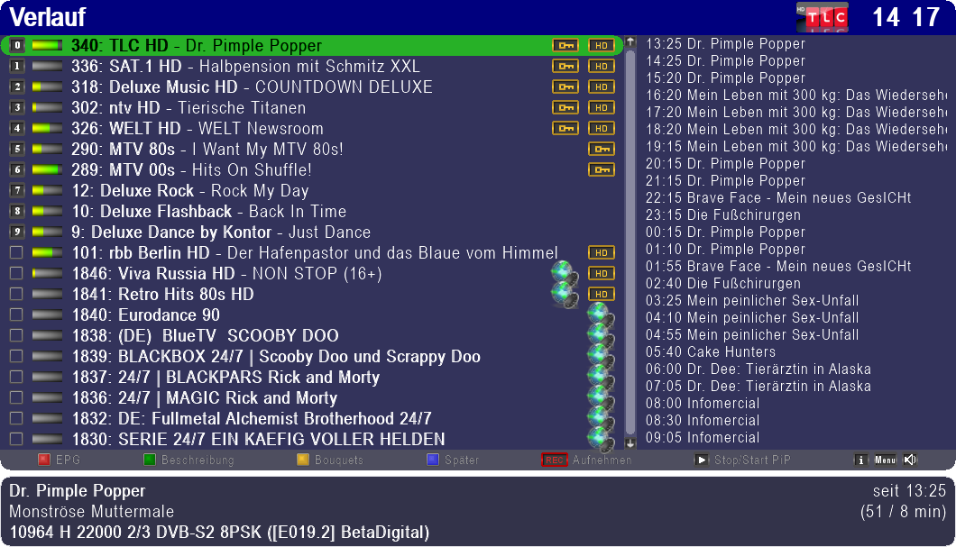 Da wären die Kanalnummern in der History zur schnellen Unterscheidung und Vermeidung kreiselnder Sat-Schüsseln eigentlich echt hilfreich.