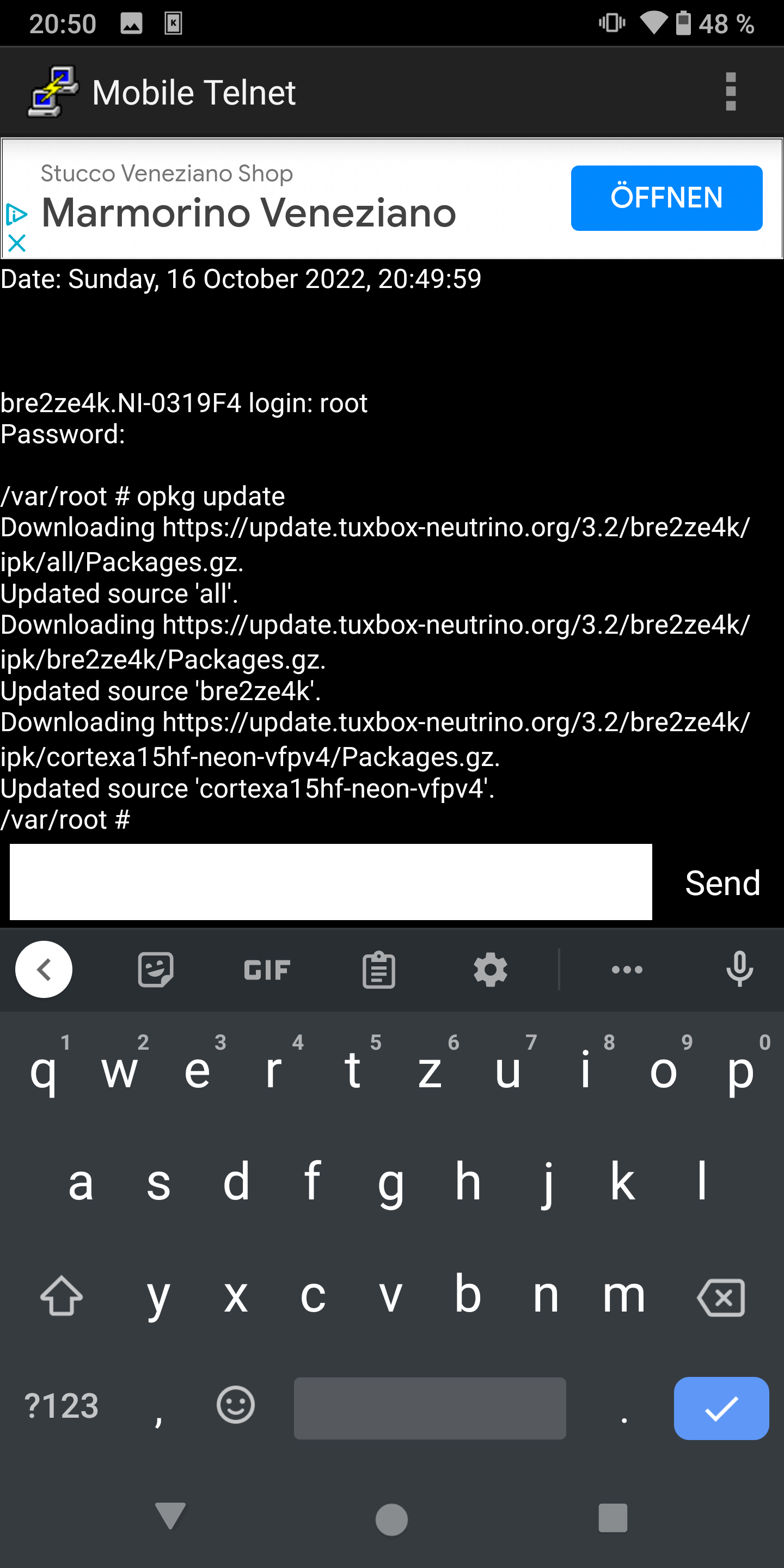 P s. Ne geht irgendwie nicht hängt jetzt bei Boot ! Komisch aber telnet geht wohl es hängt ! Teste morgen oder am Abend weiter mal! Die feeds gehen mit opkg update und opkg install kodi etc etc aber bild keines da halt ! Habe es so halt mal probiert über telnet das geht ja auch wenn es bei Boot hängt ohne Bild ! Feed von tuxi rein gemacht