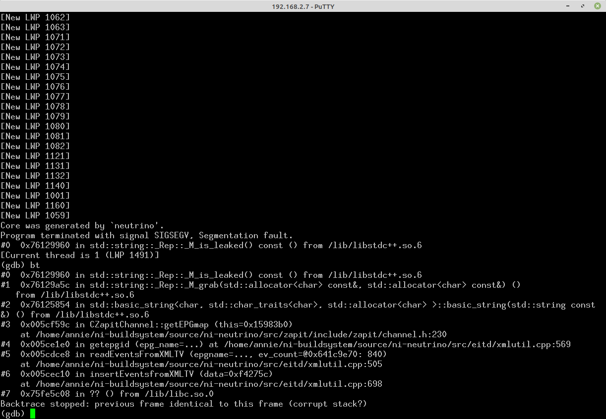 Neutrino mit den Änderungen compiliert, getauscht, Box neu gestartet, Kanallisten neu laden -> Segmentation fault