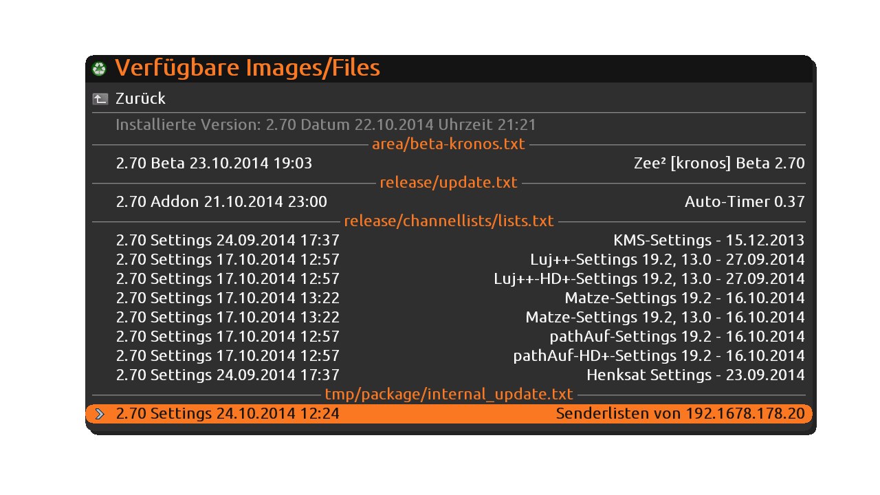 echo "http://192.168.178.20/tmp/packages/chanlists.bin S270201410241224 093ea47f78f4e182edb996dda5b767a5 Senderlisten von 192.1678.178.20" >> /tmp/package/internal_update.txtCode: Alles auswählen