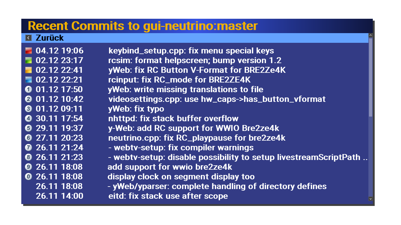 Hallo , nutze oft und gerne den Lua RSS Reader , leider funktioniert dieser komplett nur in meiner Trinity ( Shiner ) Foto1 , nach einem weiteren neuen Nightly Image ( z.B. vom 01.12.) und installieren über tmp erscheint lediglich ein Teil des kompletten RSS Reader Foto 2 , passiert aber so nur bei meiner Zee² und meiner Neo² , bei meiner Trinity V1 klappt dies aber vollständig ...