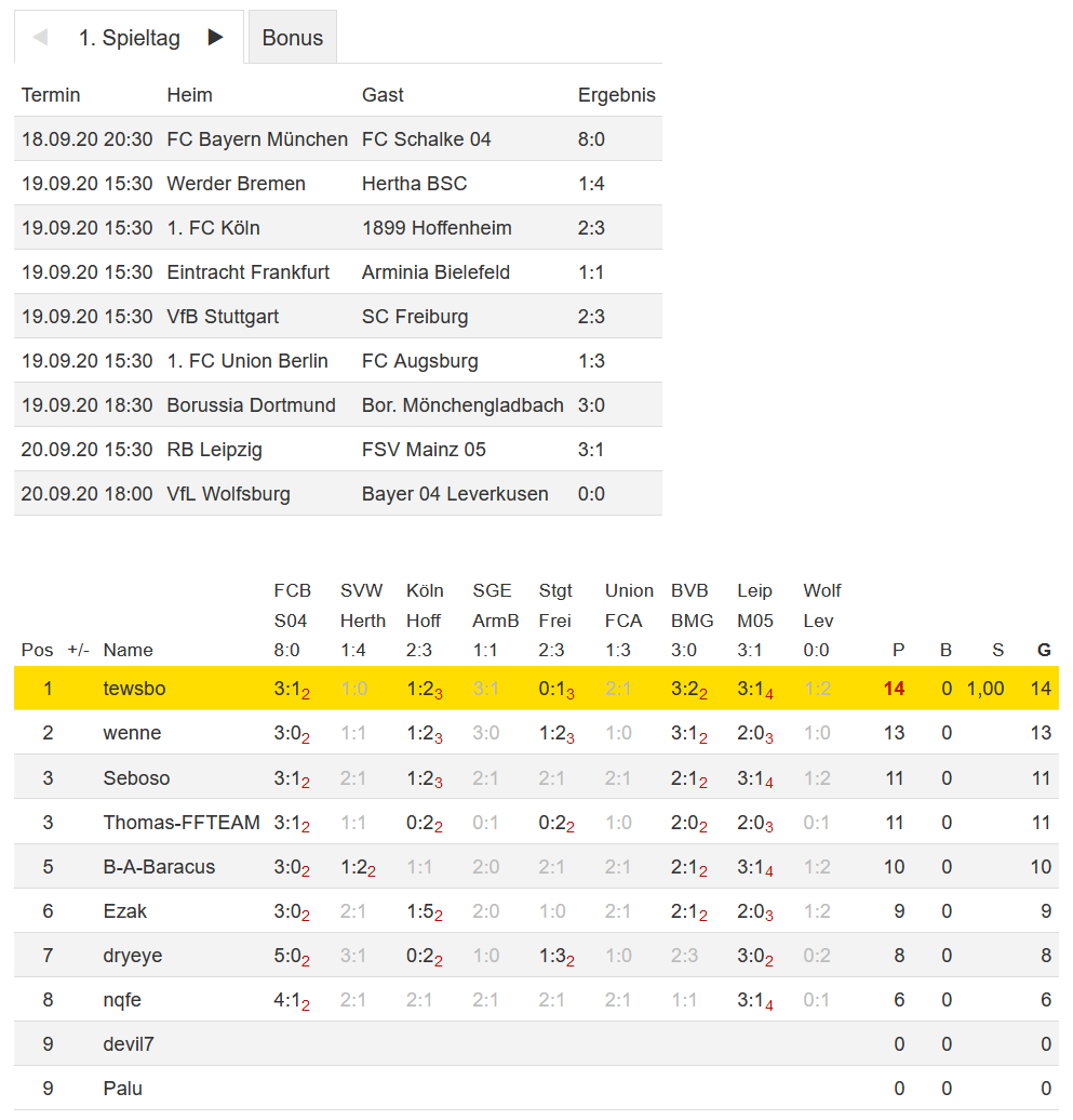 Stand 01. Spieltag - NI-Tippspiel zur Fussball-Bundesligasaison 2020/21