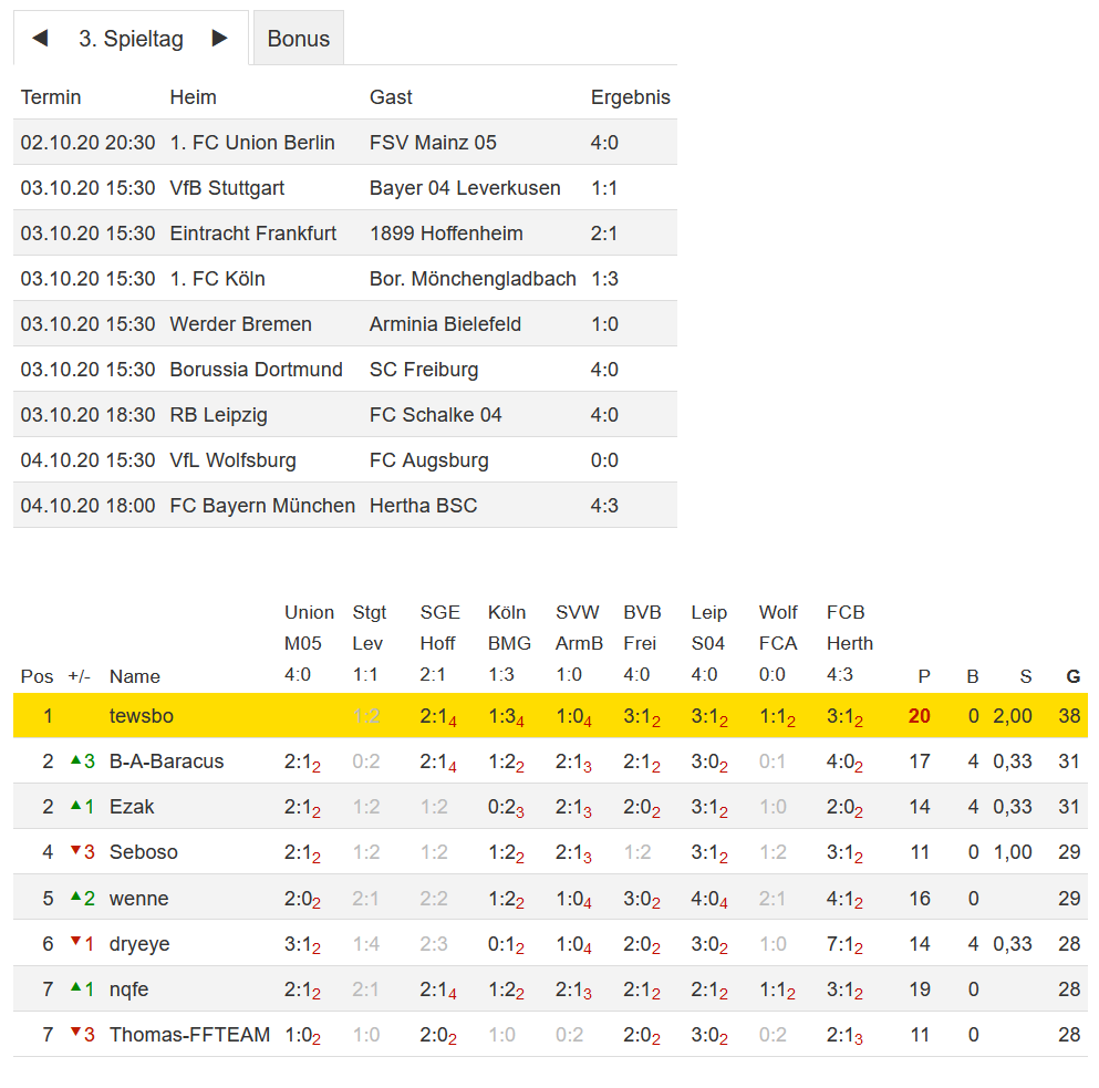 Stand 03. Spieltag - NI-Tippspiel zur Fussball-Bundesligasaison 2020/21
