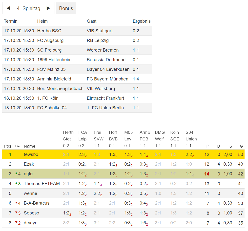 Stand 04. Spieltag - NI-Tippspiel zur Fussball-Bundesligasaison 2020/21