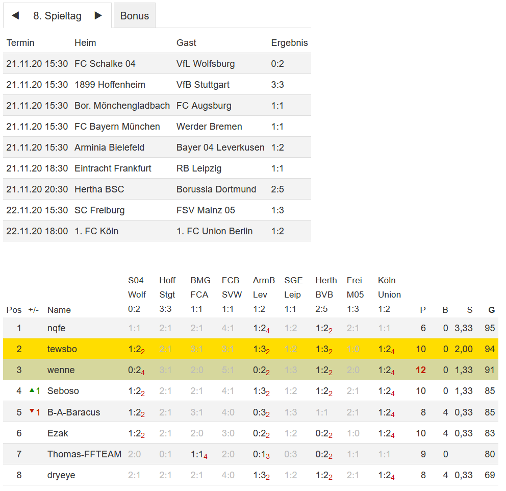Stand 08. Spieltag - NI-Tippspiel zur Fussball-Bundesligasaison 2020/21
