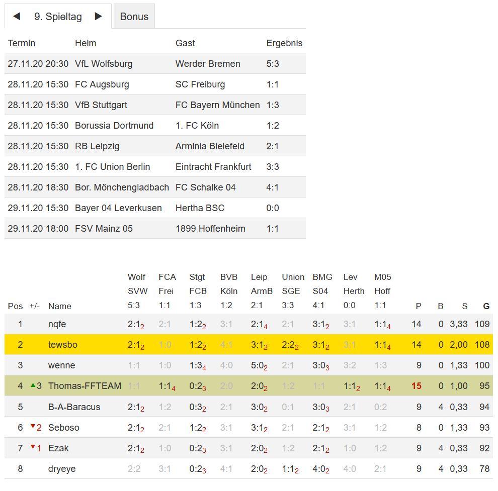 Stand 09. Spieltag - NI-Tippspiel zur Fussball-Bundesligasaison 2020/21